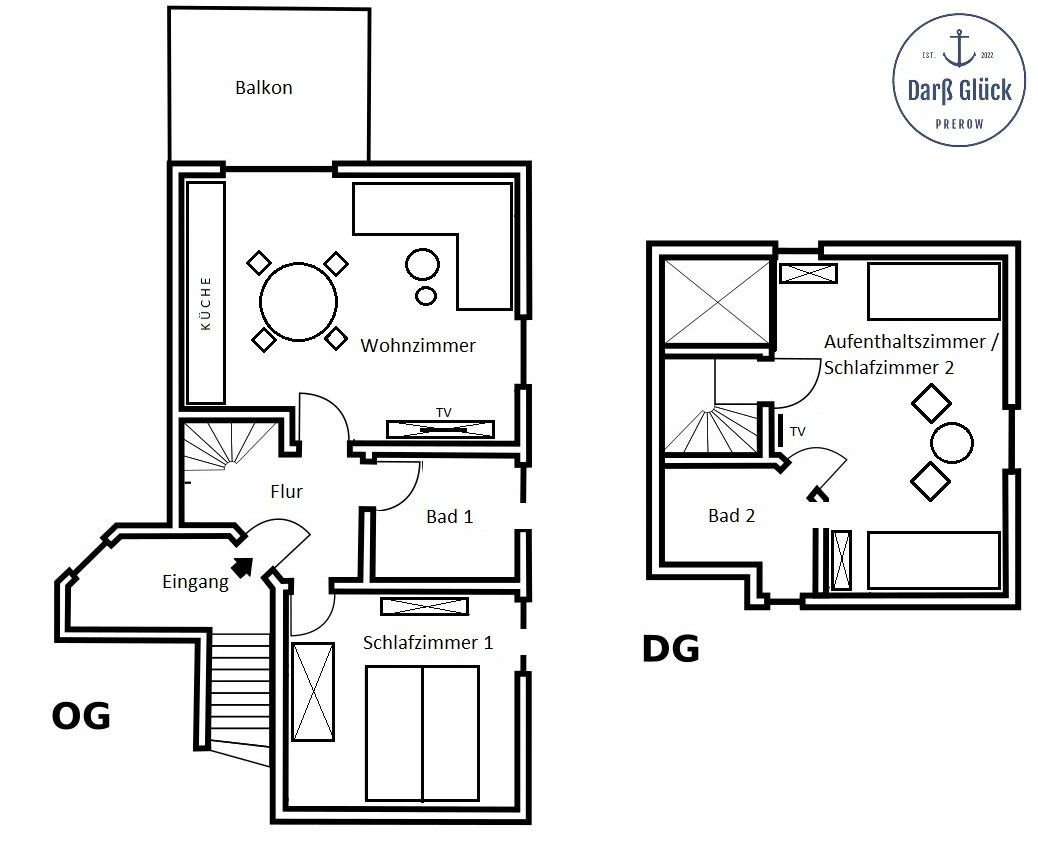 Das "Darß Glück" ist eine komfortable und clever zugeschnittene Maisonettenwohnung, die auf 59 Quadratmetern zzgl. Balkon Platz für 4 Personen und ein Baby oder Kleinkind (im Beistellbettc) bietet.